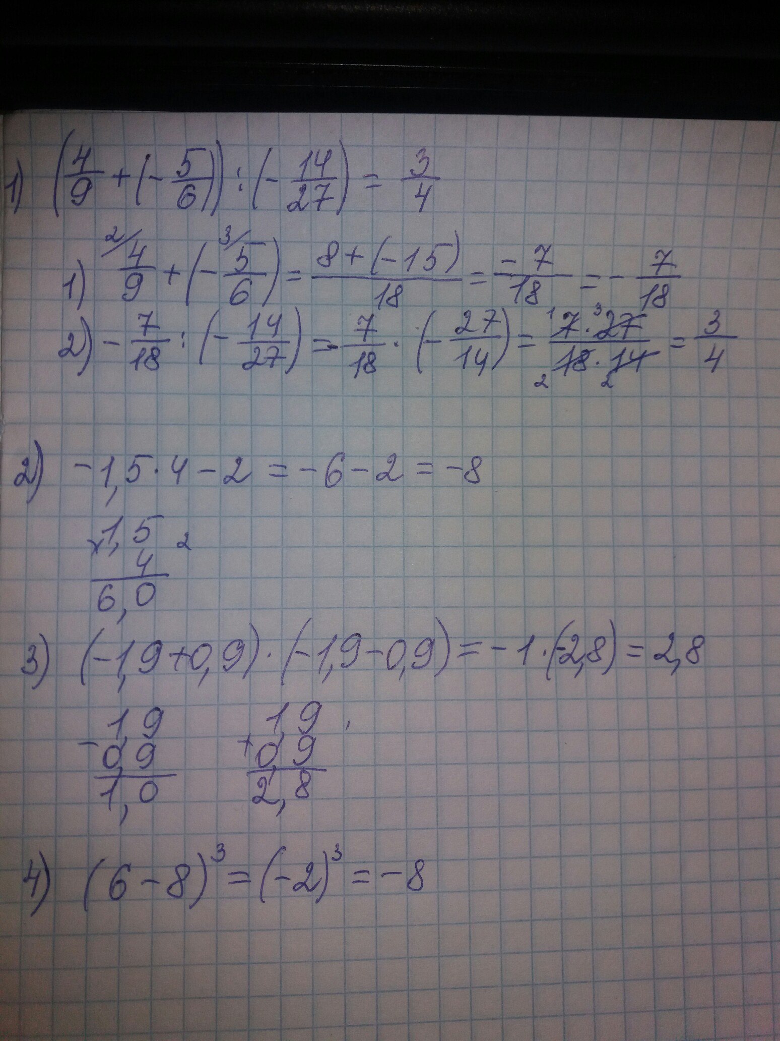 1)частное от деления суммы чисел 4/9 и -5/6 на число -14/27