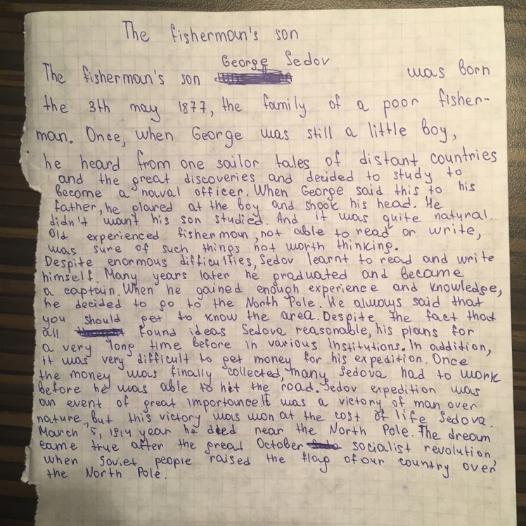 Георгий Седов родился 3 мая 1877 г. в семье бедного рыбака. Однажды, когда Георгий был еще совсем маленьким мальчиком, он услышал от одного моряка рассказы о дальних (distant) странах и великих открытиях и решил учиться, чтобы стать морским офицером (a naval officer).