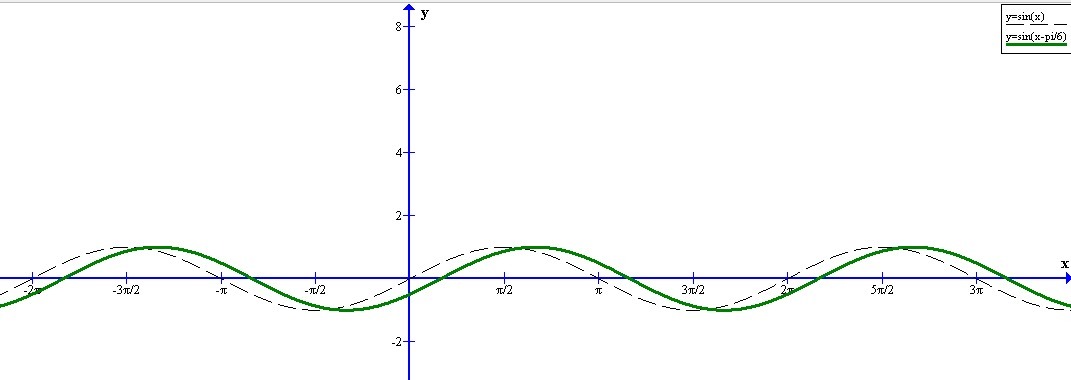 1. Строим сначала обычный график функции y = sinx затем параллельно смещаем на п/6 вправо в результате получим график функции y=sin(x-π/6).