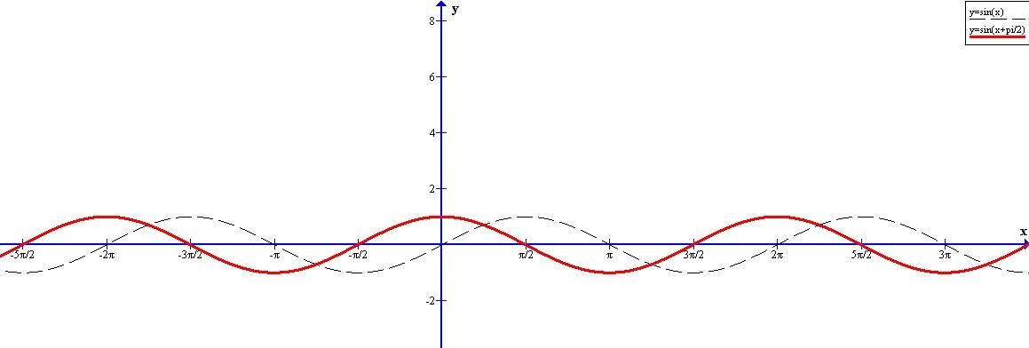 2. Аналогично строим график функции y=sin x затем параллельно смещаем на п/2 влево, получим график функции y=sin(x+π/2).