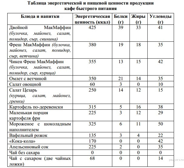 Любовь – мастер спорта по стрельбе из лука. В течение последнего месяца она активно готовится к спортивным соревнованиям, проводя в тире по 6 часов в день. После одной из утренних тренировок, продолжавшейся 3 часа 20 минут, она решила с подругами пообедать в ресторане быстрого питания. Используя данные таблиц 1 и 2, предложите спортсменке оптимальное по калорийности и количеству жиров меню из перечня блюд и напитков для того, чтобы компенсировать энергозатраты во время очередной тренировки. При выборе учтите, что Любовь обязательно закажет картофель по-деревенски, блюда и напитки с минимальным количеством жиров. В ответе укажите: энергозатраты спортсменки во время тренировки; заказанные блюда, которые не должны повторяться; количество жиров в них; калорийность блюд, которая не должна превышать энергозатраты во время тренировки.