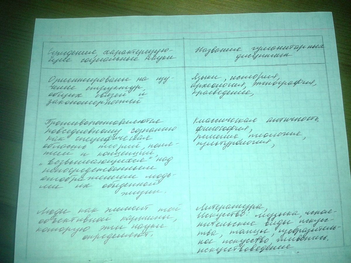 составьте таблицу в первую колонку которой выпишете из текста все суждения характеризующие социальные науки а во вторую название гуманитарных дисциплин к которым они относятся .............суждение: Сам термин «социально-гуманитарное познание» указывает на то, что обществознание «составлено» из двух разных видов познания, т. е. термин этот фиксирует не столько связь, сколько различия. Ситуация становления научного обществознания «подкрепила» эти различия, обособив, с одной стороны, социальные науки, ориентированные на изучение структур, общих связей и закономерностей, и, с другой стороны, гуманитарное познание с его установкой на конкретно индивидуальное описание явлений и событий общественной жизни, человеческих взаимодействий и личностей. Вопрос о соотношении социального и гуманитарного в обществознании был предметом постоянных дискуссий; в ходе этих дискуссий побеждали то сторонники четкого методологического определения дисциплин (и, соответственно, размежевания), то сторонники их методологического сближения (и соответствующей предметной интеграции). Однако важно отметить, что указанное различение и противопоставление социальных и гуманитарных дисциплин научного обществознания в основном трактовалось как ситуация «естественная», соответствующая общей логике разделения и связывания человеческой деятельности. Само оформление этой ситуации в недолгой и недавней истории становления научного обществознания, как правило, во внимание не принималось. Различия социальных наук и гуманитарного познания проявлялись и в отношениях научного обществознания с повседневным сознанием людей. Социальные науки четко противопоставлялись повседневному сознанию как специфическая область теорий, понятий и концепций, «возвышающихся» над непосредственным отображением людьми их обыденной жизни (отсюда в догматическом марксизме — идея внедрения научного мировоззрения в повседневное поведение людей). Гуманитарное познание в значительно большей степени считалось со схемами повседневного человеческого опыта, опиралось на них, более того, часто оценивало научные построения через их соответствие формам индивидуального бытия и сознания. Иными словами, если для социальных наук люди были элементами той объективной картины, которую эти науки определяли, то для гуманитарного познания, напротив, формы научной деятельности проясняли свое значение как схемы, включенные в совместную и индивидуальную жизнь людей.