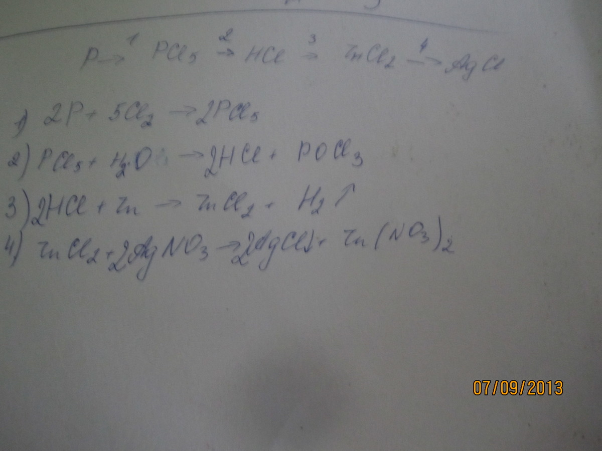 Фосфор - хлорид фосфора (5) - хлороводород - хлорид цинка - хлорид серебра (цепочку написать)