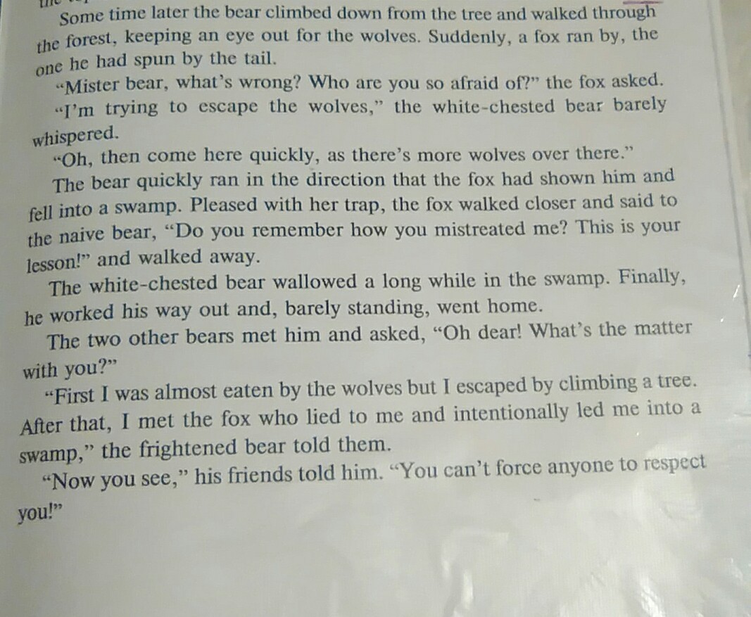 Тот, которого он обманул лаулем. медведь, что случилось? Кого ты так боишься? »- спросил лиса. Я пытаюсь убежать от волков, с которым едва прошептал медведь с белой грудью.« О, иди сюда быстро, так как там больше волка ». Медведь быстро побежал в Что лиса показала ему и упала в болото. Довольная своей ловушкой, лиса подошла ближе и сказала наивному медведю: «Вы помните, как вы плохо обращались со мной? Это ваш урок! »И ушел. Белогрудый медведь долго валялся в болоте. Наконец, он пробрался и, едва стоя, вернулся домой. Два других медведя встретились с ним и спросили:« О, дорогая ! Что с тобой взбираешься на дерево. Сначала я был съеден волками, кроме меня, после этого, я встретил лису, которая солгала мне и преднамеренно вела болото, - сказал испуганный медведь, - теперь вы видите, - сказали ему его друзья. T заставлять кого-либо уважать вас