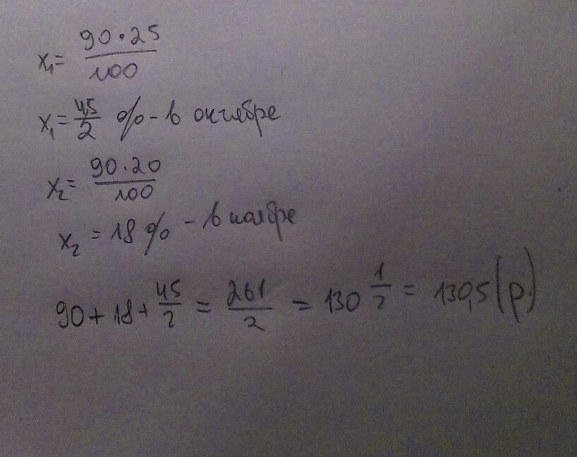 В сентябре 1 кго винограда стоит 90 рублей , в октябре виноград подорожал на 25 % ,а в ноябре ещё на 20 % .Сколько рублей стоит 1 кг винограда после подорожания в ноябре?