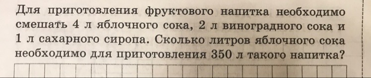 4+2+1=7 литров,на одну порцию сока,350:7=50 порций,4*50=200 литров надо яблочного сока