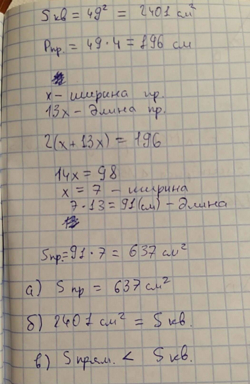 Ответ: Sпр = 637 см^2, Sкв = 2401 см^2, Sкв>Sпр