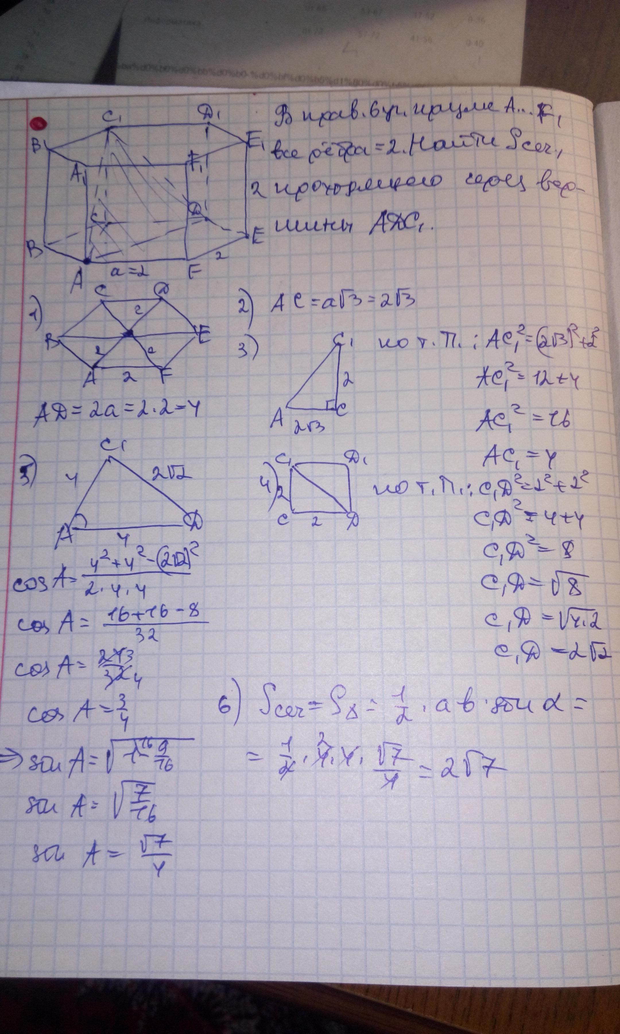 в правильной шестиугольной призме ABCDEFA1B1C1D1E1F1 все рёбра равны 2 найдите площадь сечения прозодящего через вершины AD C1
