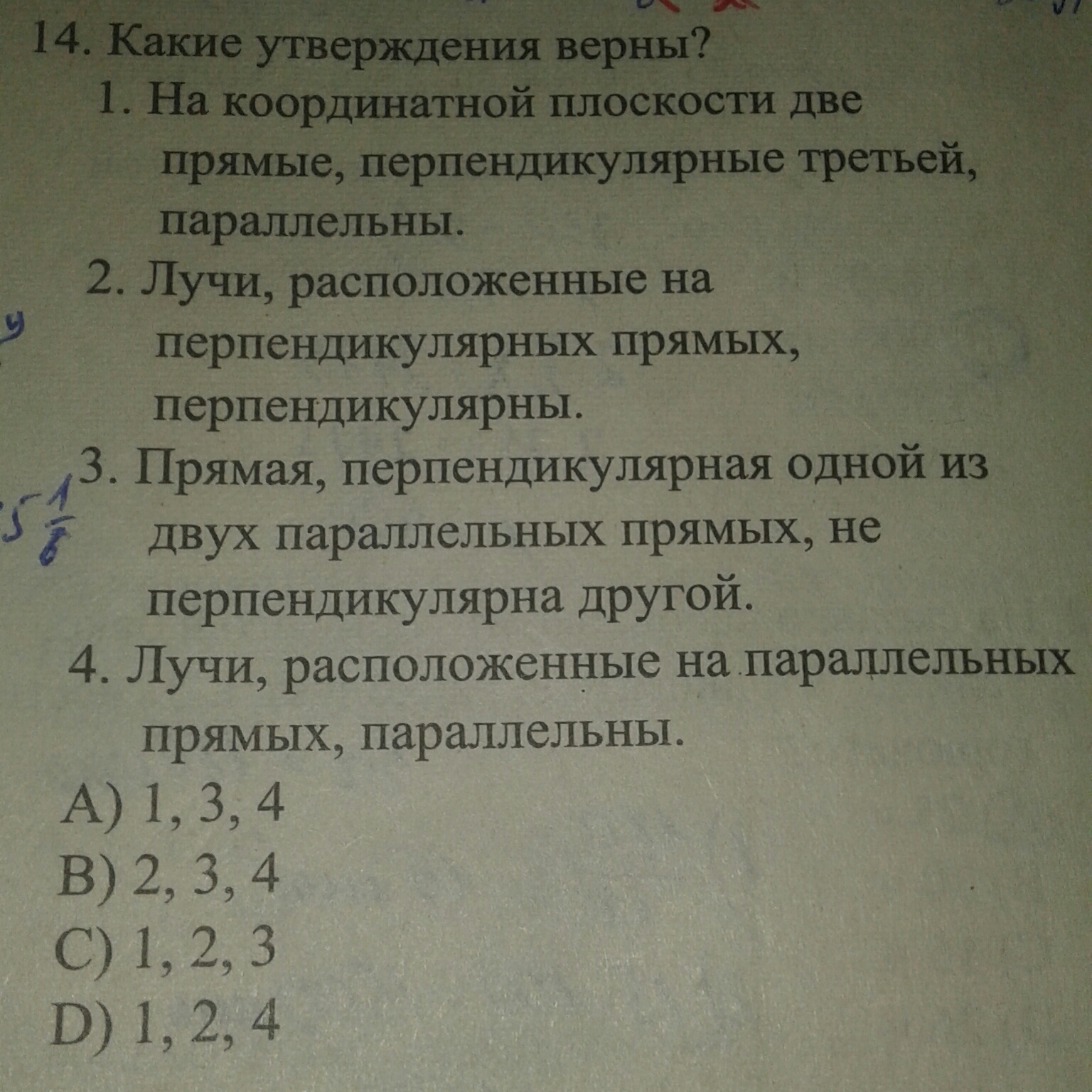 Верно первое утверждение, поскольку если две прямые, пересекая третью, образуют прямой угол, то эти две прямые параллельны (это при условии, что координатная плоскость двумерна). Верно так же и второе утверждение и четвёртое (если луч располагается на какой-либо прямой, то он пронизывает данную прямую) Ответ: D)