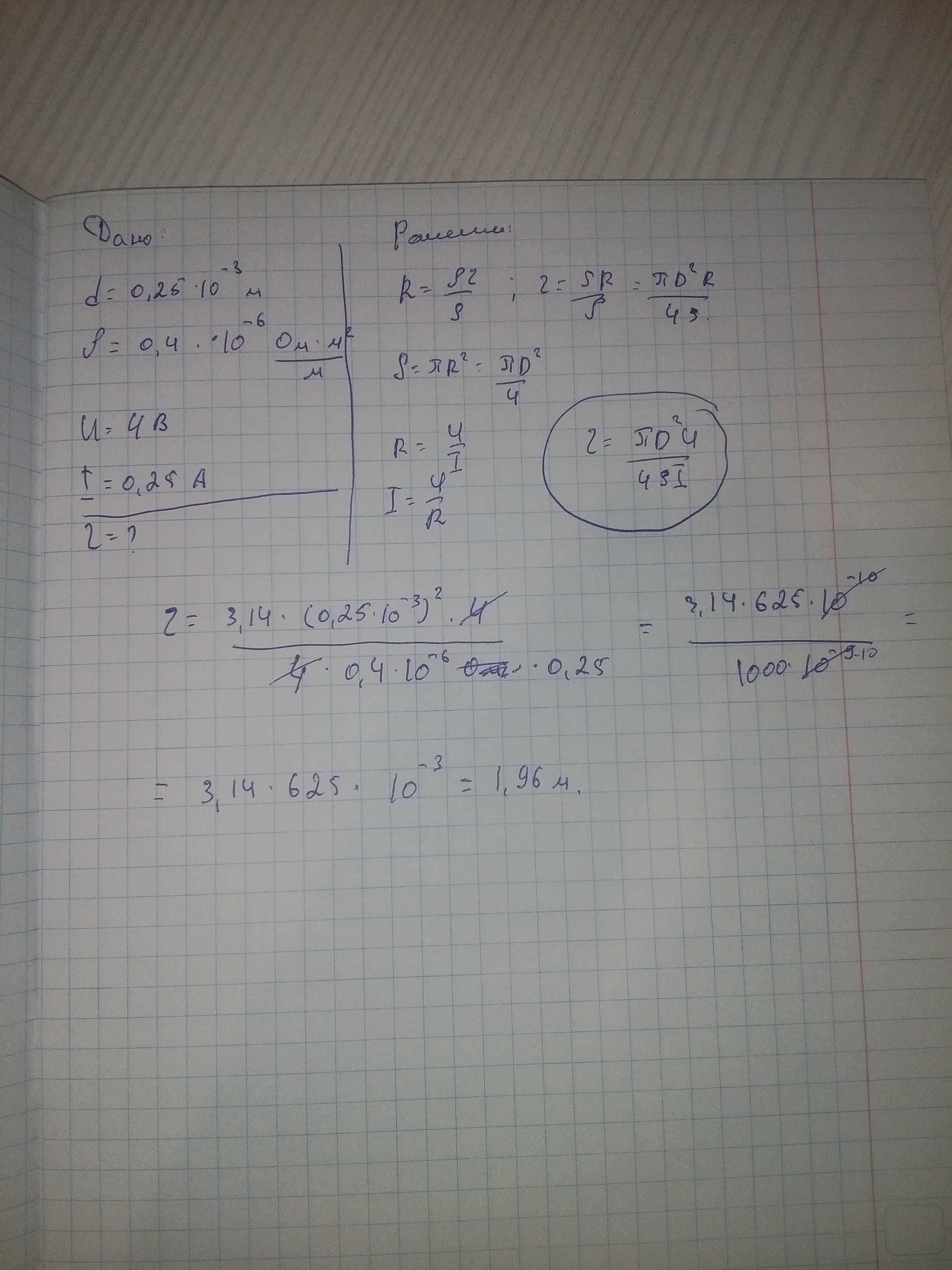 Определите длину проволоки диаметром 0,25 мм, намотанную на резистор, если удельное