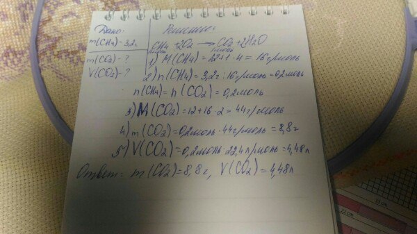 определите массу и объем углекислого газа, образовавшегося при сжигании 3,2г метана в нормальных условиях.