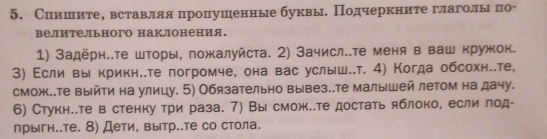 1. Задерните(пов.накл) шторы, пожалуйста. 2.Зачислите(пов.накл) меня в ваш кружок. 3.Если вы крикните(пов.накл) погромче, она вас услышит. 4.Когда обсохните(пов.накл), сможете выйти на улицу. 5.Обязательно вывезите (пов.накл) малышей летом на дачу.6. Стукните(пов.накл) в стенку три раза.7.Вы сможете(пов.накл) достать яблоко, если подпрыгните(пов.накл). 8. Дети, вытрите(пов.накл) со стола.