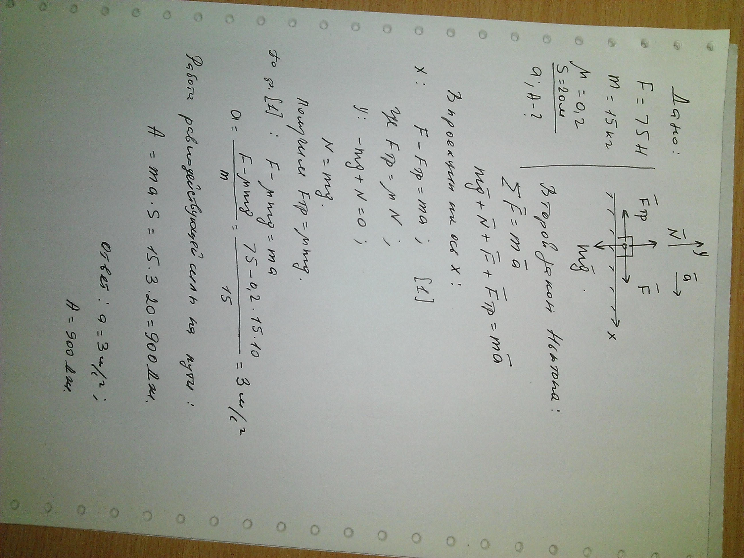 На тело в горизонтальном направлении действуют сила тяги ,равная 75Н, и сила трения. С каким ускорением движется тело,если его масса равна 15 кг., а коэффициент трения 0,2? Чему равна работа равнодействующей силы на пути 20м?