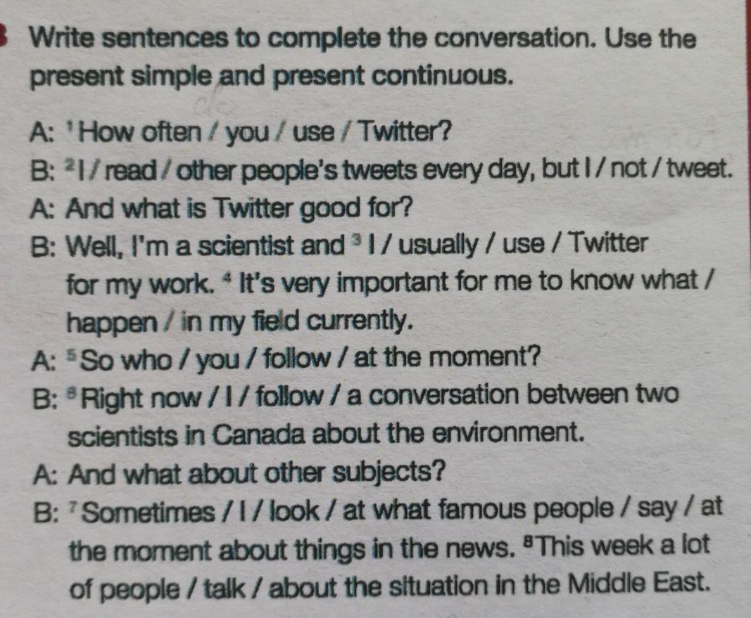 B: Well I'm scientist and I usually use Twitter for my work. It's very important for me to know what happens in my field currently(simple)