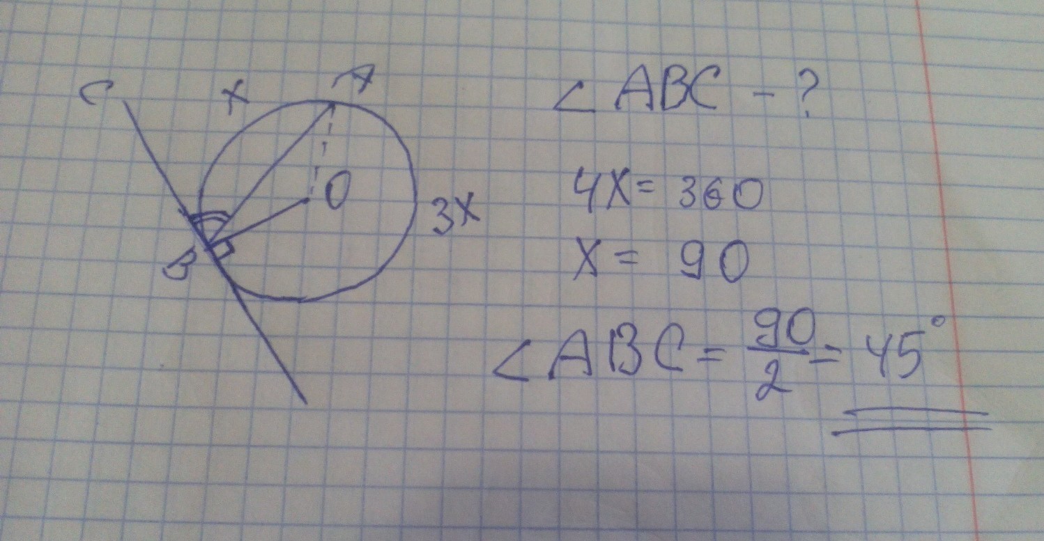 Через конец хорды, делящей окружность в отношении 1:3 проведена касательная. Вычислите углы между хордой и касательной.