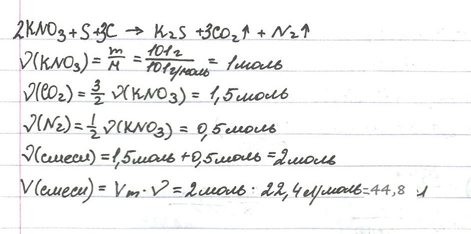 Сколько литров (н.у.) газовой смеси образуется при взрыве черного пороха ,содержащего 101 гр нитрата калия? Mr(KNO3)= 101