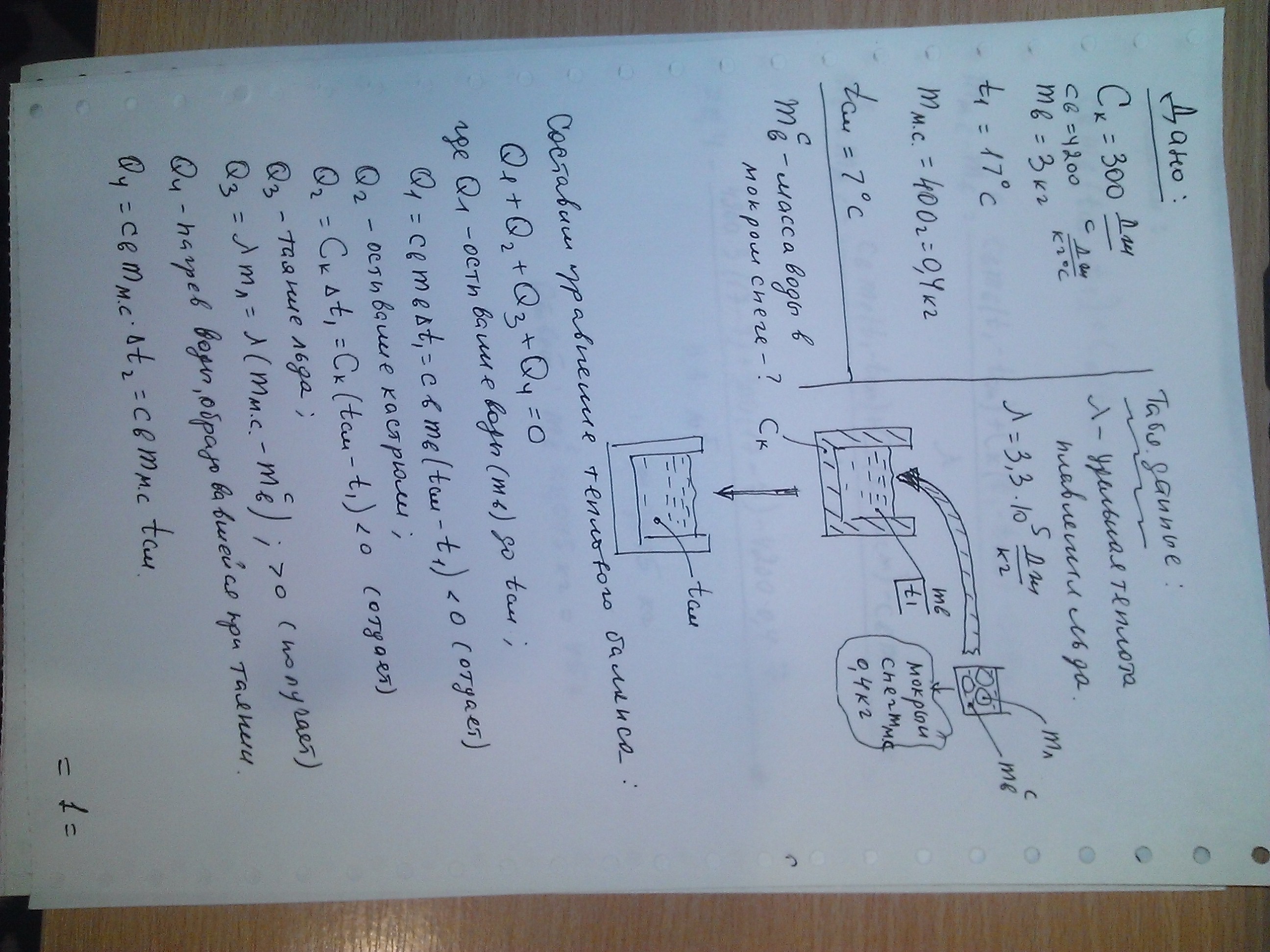 В кастрюле теплоемкостью 300 Дж/*С находится вода массой 3 кг при температуре 17*С. В кастрюлю опустили 400 г мокрого снега. Сколько воды содержал снег, если после его таяния температура воды стала равной 7 *С?