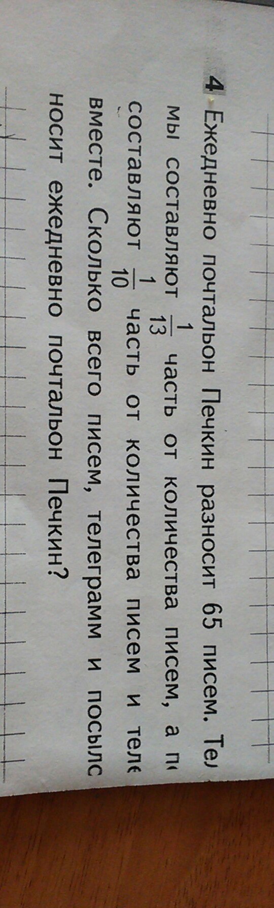 65:13=5(п.) телеграммы65+5=70(п.)письма и телеграммы70:10=7(п.) по..(не поняла что там написано)70+7=77 всего