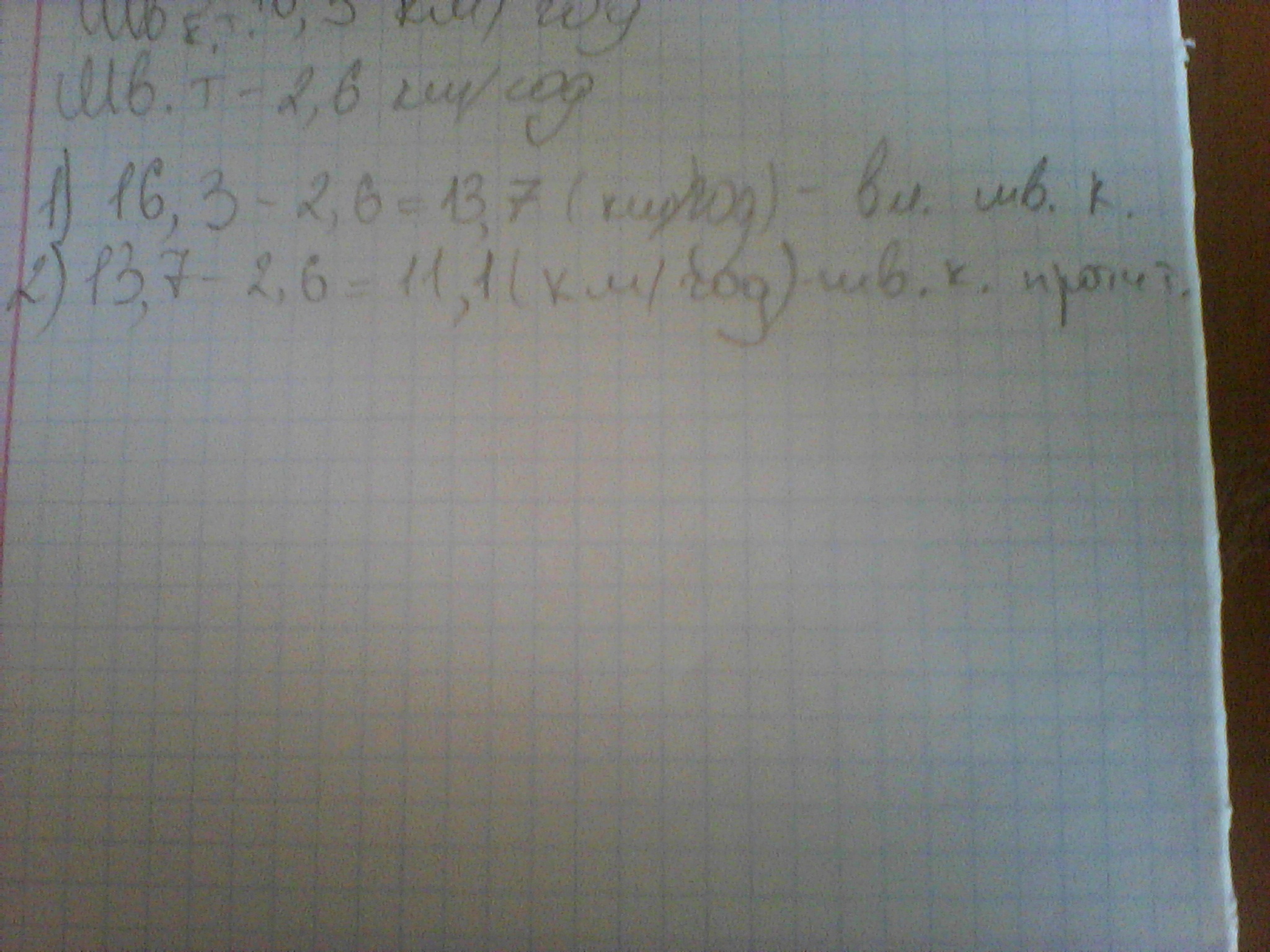 Швидкість катера за течією річки дорівнює 16,3 км/год, швидкішть течії - 2,6 км/год. Знайдіть власну швидкість катера і його швидкість проти течії проти течії