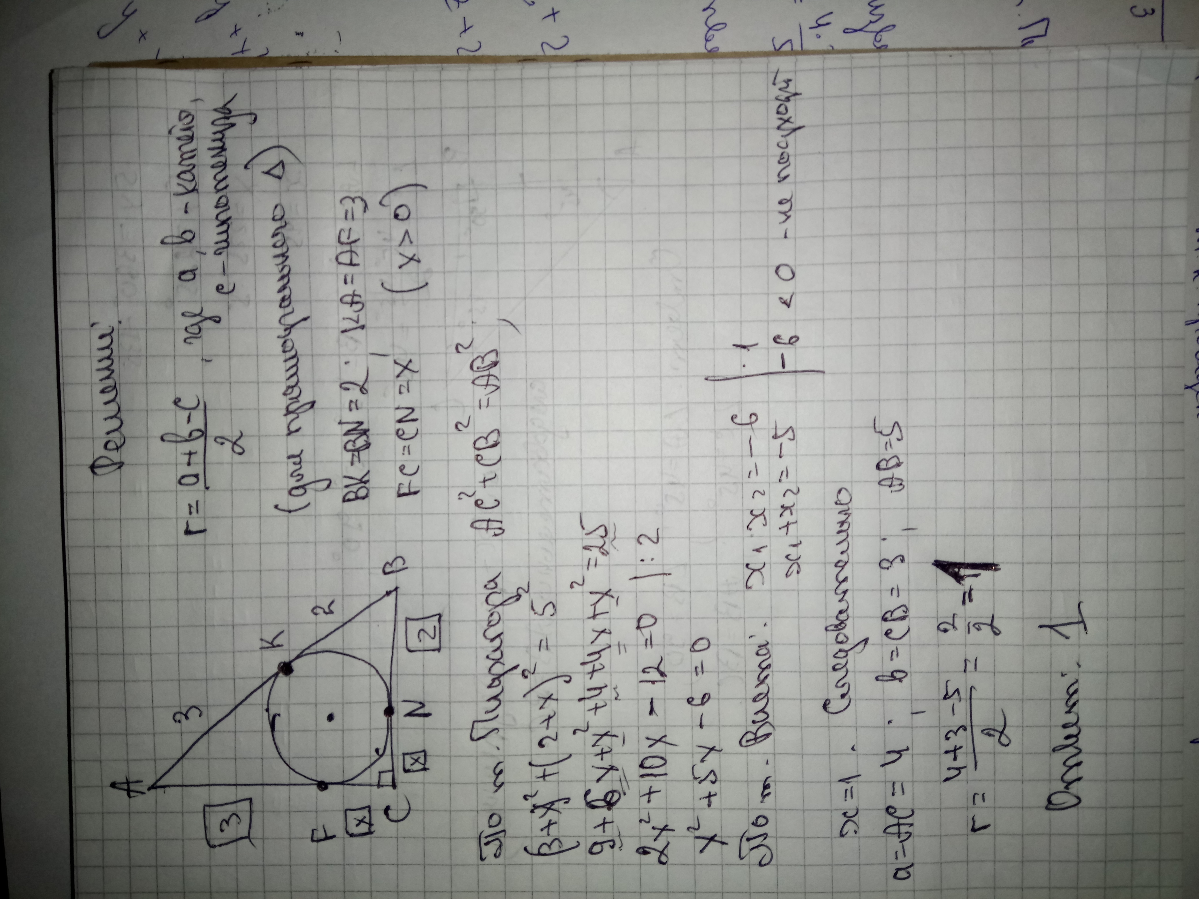 в прямоугольном треугольнике отрезки гипотенузы, на которые её делит точка касания вписанной окружности , равны 2 и 3. найти радиус вписанной окружности