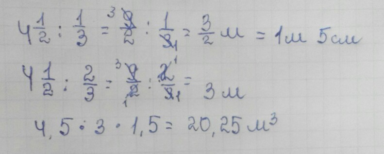 Длина комнаты имеющей форму прямоугольного параллелепипеда 4 целых 12 метра ,ширина составляет 1/3 длины , а высота 2 3.Вычислите объем комнаты