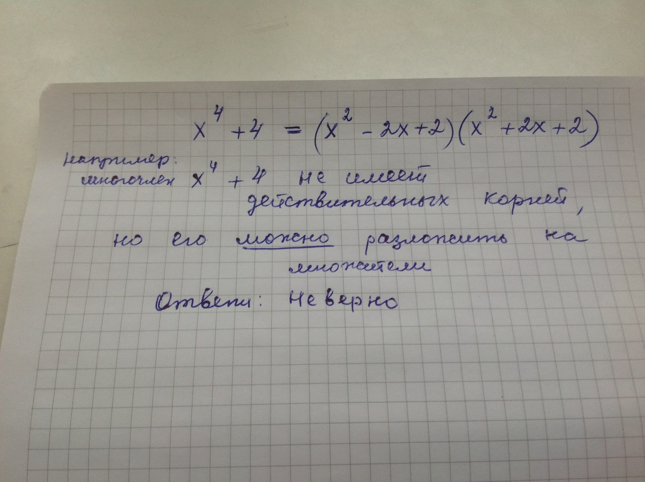 Верно ли, что если многочлен четвёртой степени не имеет корней, то его нельзя разложить на множители (т. е. представить в виде произ- ведения двух многочленов меньшей степени)?