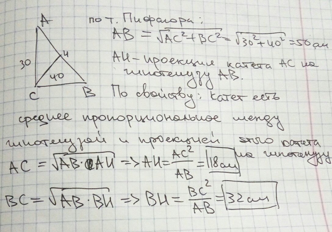 катети прямокутного трикутника 30см і 40см. Знайти довжини відрізків на які поділяє гіпотенузу, висота проведена до неї.