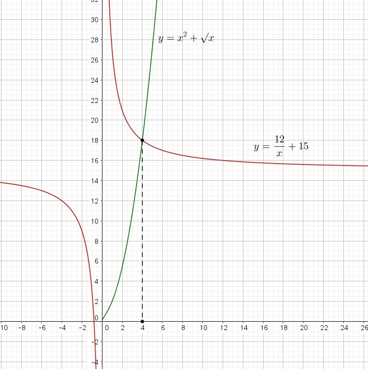 Функция в левой части возрастает на ОДЗ, а функция в правой части - очевидно, убывает. Значит уравнение может иметь не более одного корня. х=4 - легко подбирается: 4²+√4-12/4=16+2-3=15.