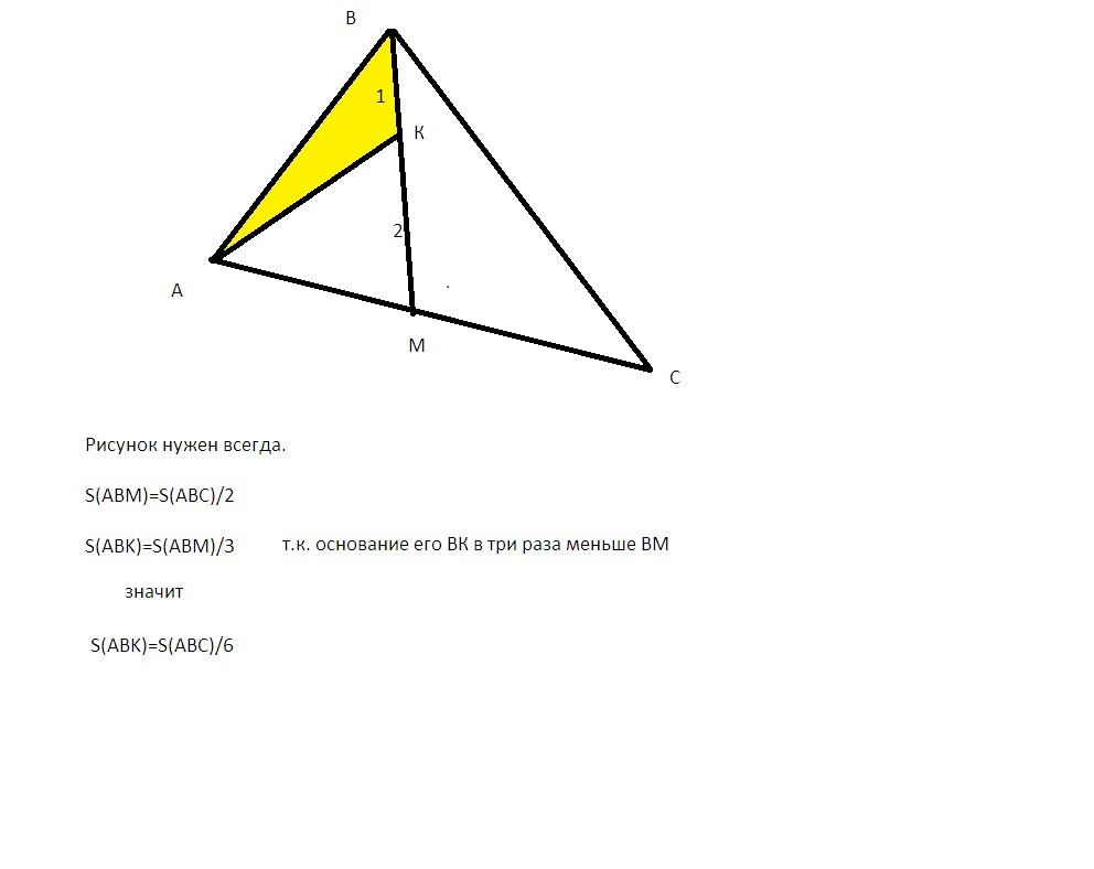 В треугольнике ABC на медиане BM взята точка K так,что BK:KM=1:2.Найдите отношения площадей треугольников ABK и ABC.Рисунок не нужен