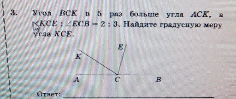 угол ACK-X, угол ВСК-5x; x+5x=180; 5x=150; значит угол КСЕ+угол ЕСВ=150; так как отношение этих углов-2:3, то 150 делим на (2+3)= 30-1 часть; угол КСЕ=30×2=60 градусов
