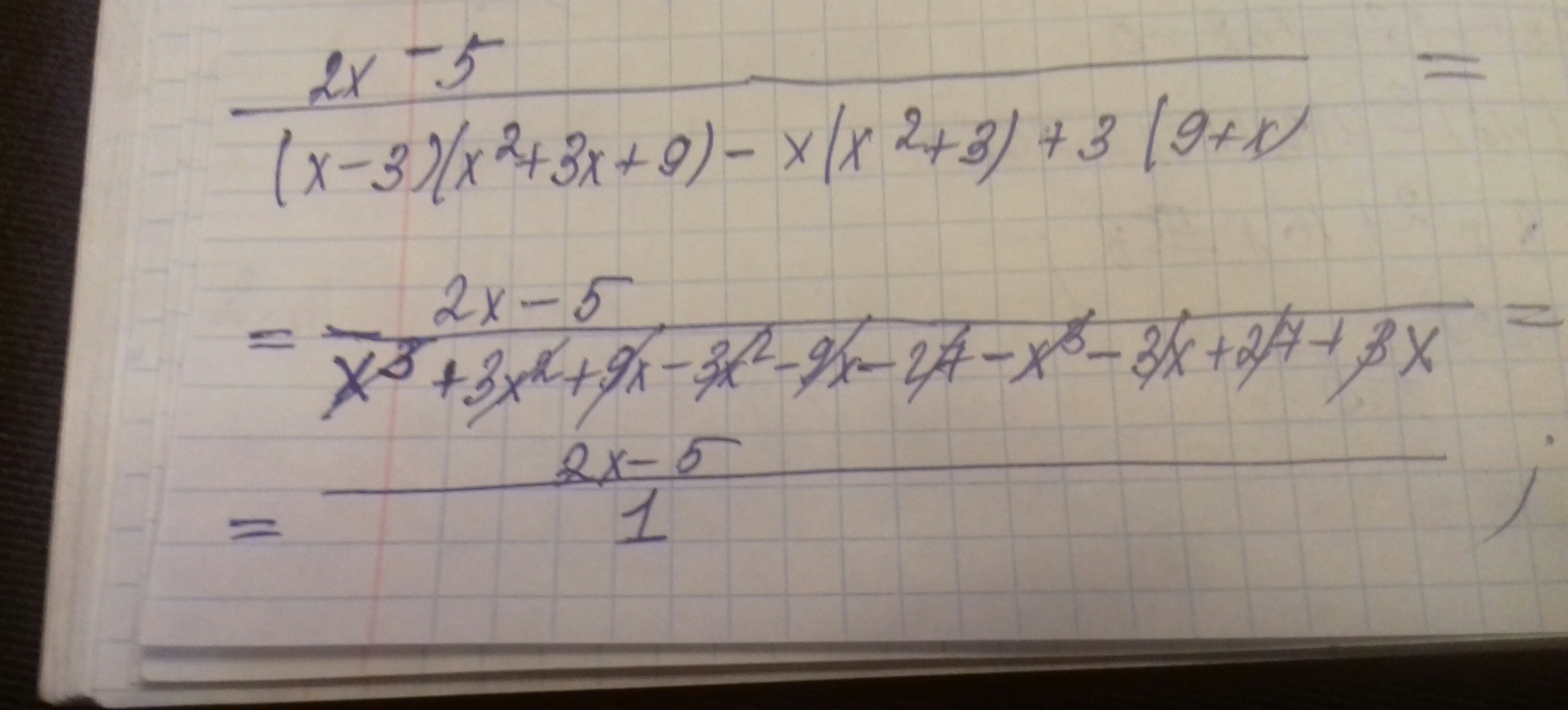 2х-5/(х-3)(х²+3х+9)-х(х²+3)+3(9+х)=2х-5:х³+3х²+9х-3х²-9х-27-х³+3х+27+3х=2х-5