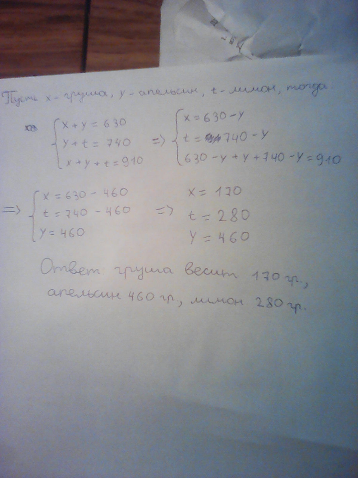 груша и апельсин весят 630 г, апельсин и лимон весят 740г, а все фрукты в месте 910 г,