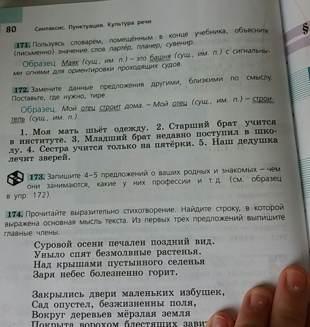 171 номер надо делать так в конце учебника есть несколько страниц где написаны разные слова и что они означают тебе надо найти вот такие слова партер планер сувенир пишишь как в образце и всё. прости второе я не знаю.