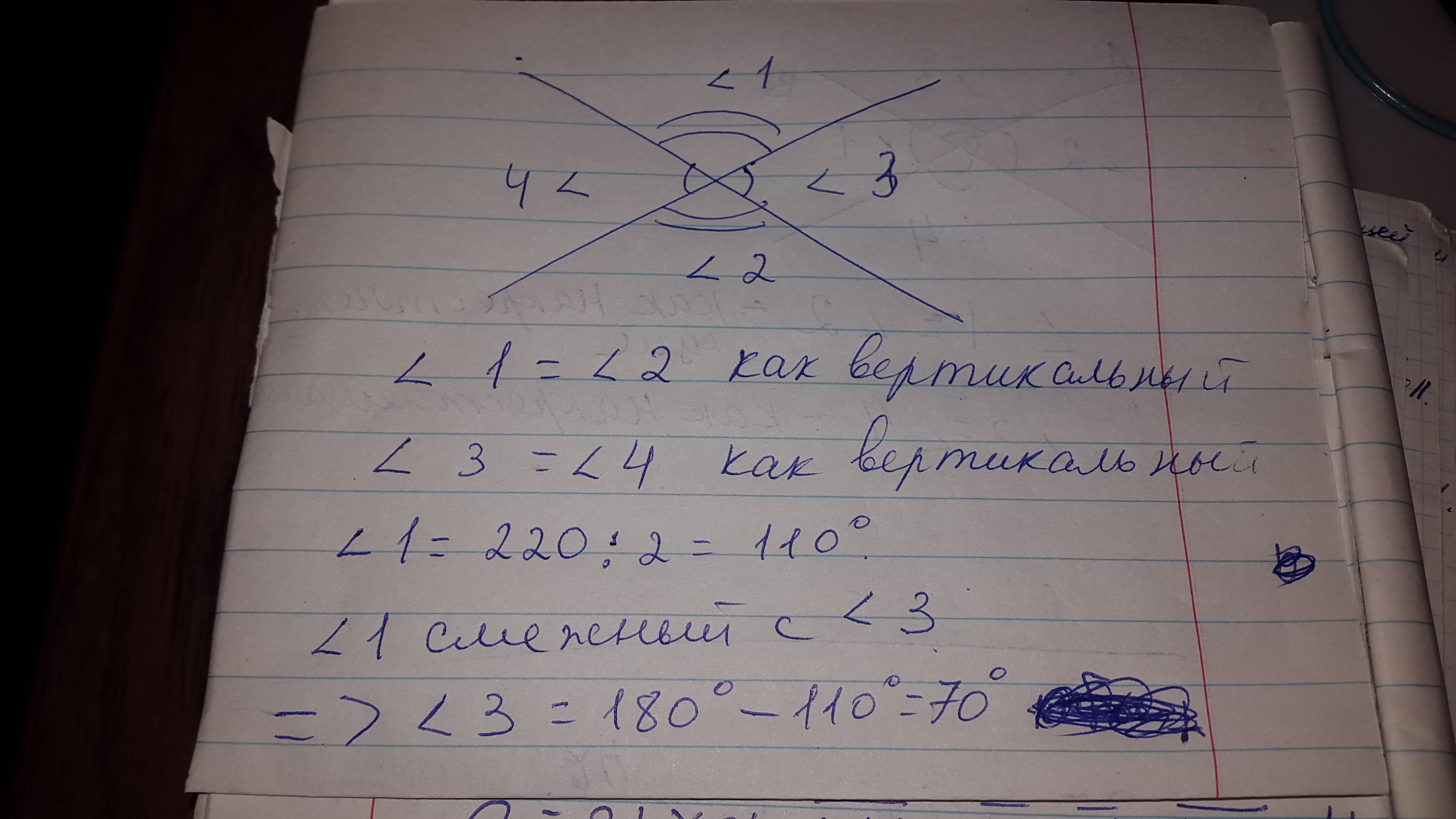 даны две прямые A и B пересекающиеся в точке O, найти угол 1, угол 2, угол и угол 4 образованные при пересечении прямых По условию угл 1 + угл 2 = 220градусов