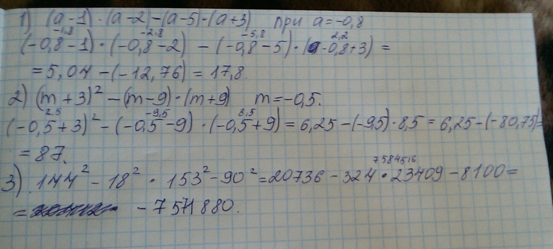 Помогите пожалуйста срочно надо решить примеры. 1.(a-1)(a-2)-(a-5)(a+3) при a=-0,8 2.(m+3)в квадрате - (m-9)(m+9) при m=-0,5 3.144в квадрате - 18 в квадрате