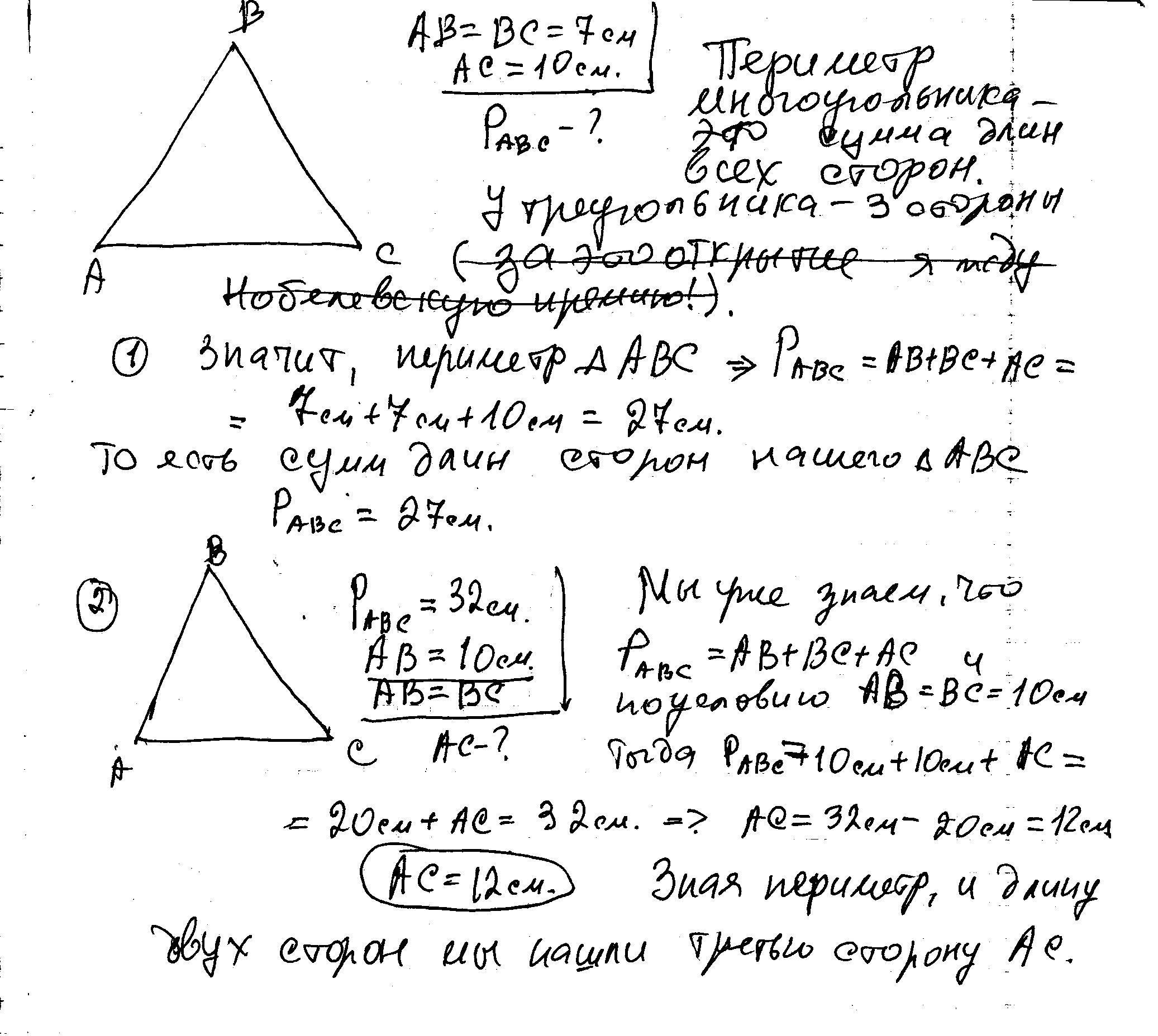 1) основание равнобедренного треугольника равно 10 см. , а каждая из боковых сторон - 7 см. Найдите периметр треугольника.