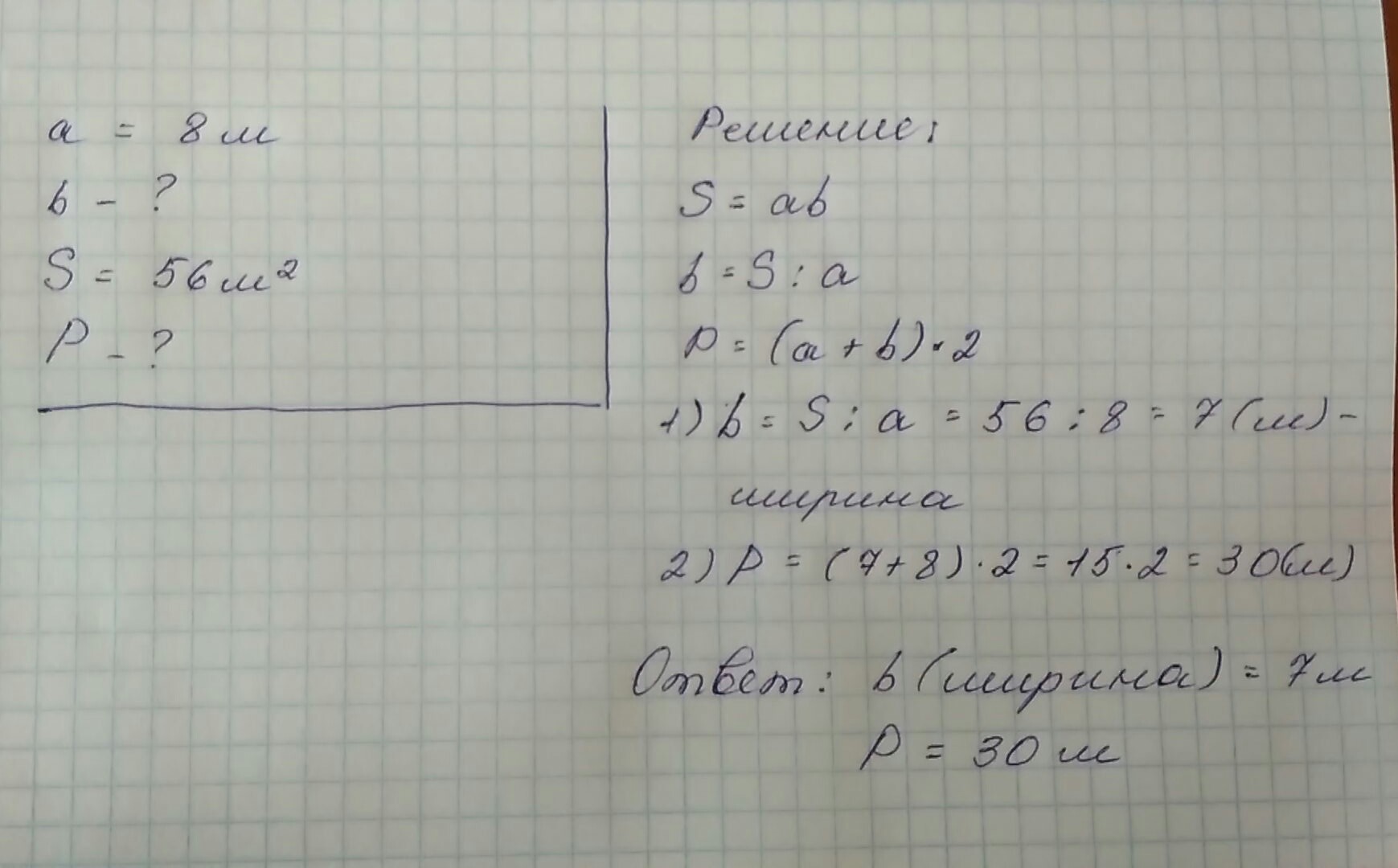 Длина вольера для тигра 8м,площадь 56м в кводрати .какова. Ширина вальера?чему равен периметр вольера?