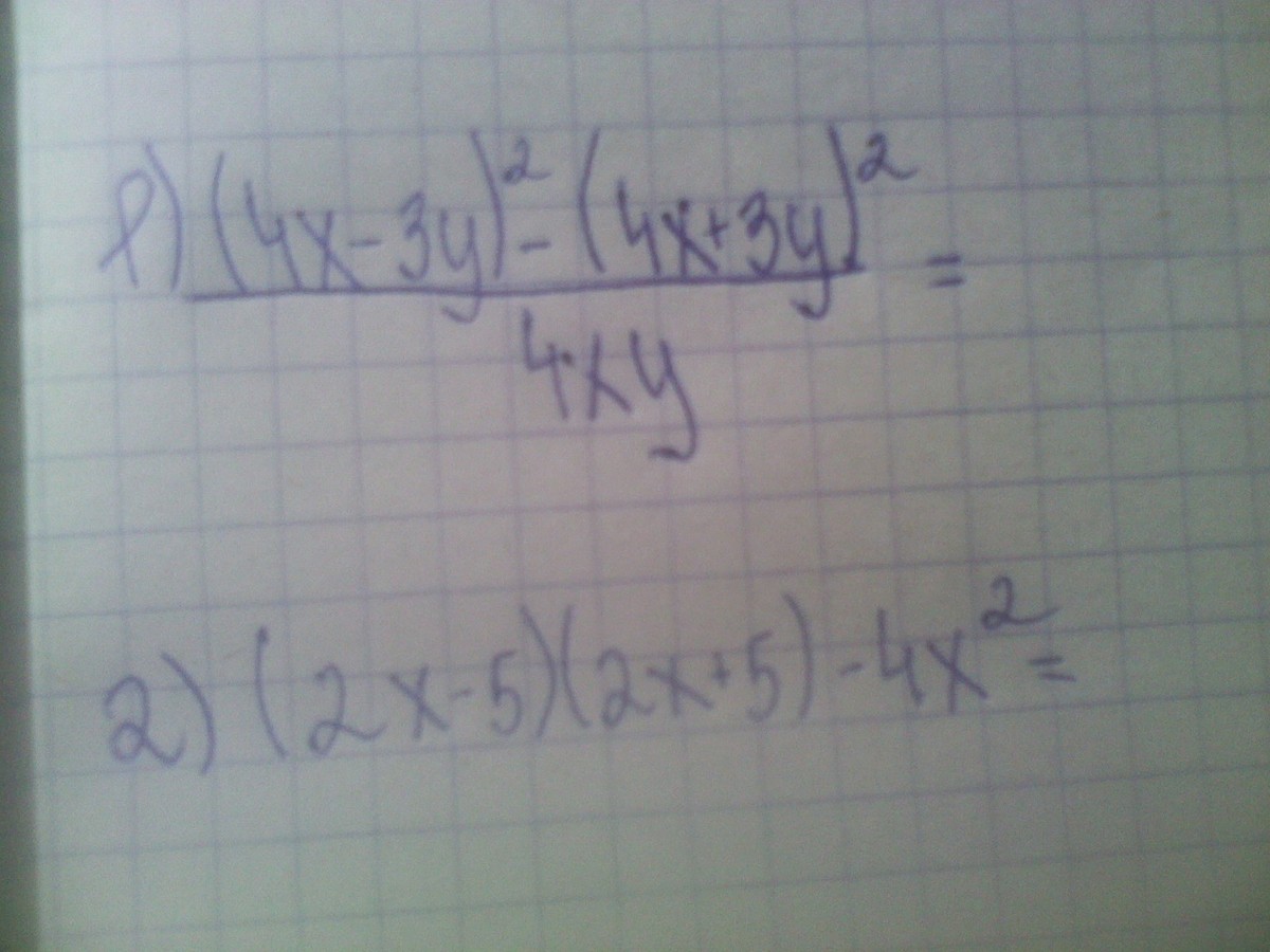1) frac{(4x-3y) ^{2} -(4x+3y) ^{2} }{4xy} = frac{(4x-3y-(4x+3y))(4x-3y+4x+3y)}{4xy} = \  \ = frac{(4x-3y-4x-3y)*8x}{4xy} = frac{-6y*8x}{4xy} =- frac{48xy}{4xy} =-12
