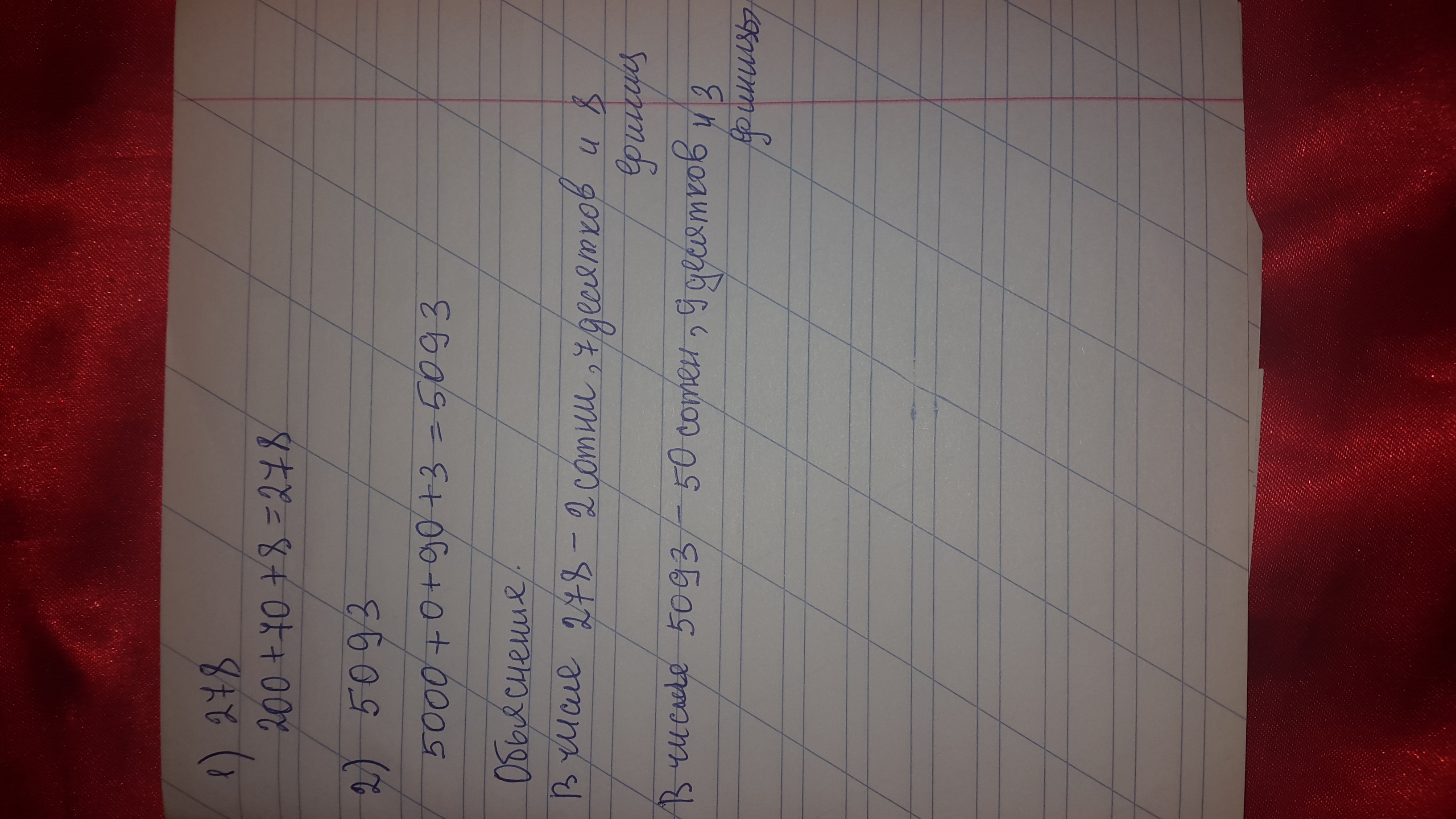 Разрядные слагаемые- это по отдельности сотни, десятки, единицы, тысячи и тп. 1) 278=200+70+8. 2) 5093=5000+90+3.