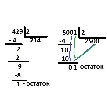 Привет.помоги сделать в столбик эти примеры:1)429:2. 2)5 001:2. Это все надо в столбик с остатком.