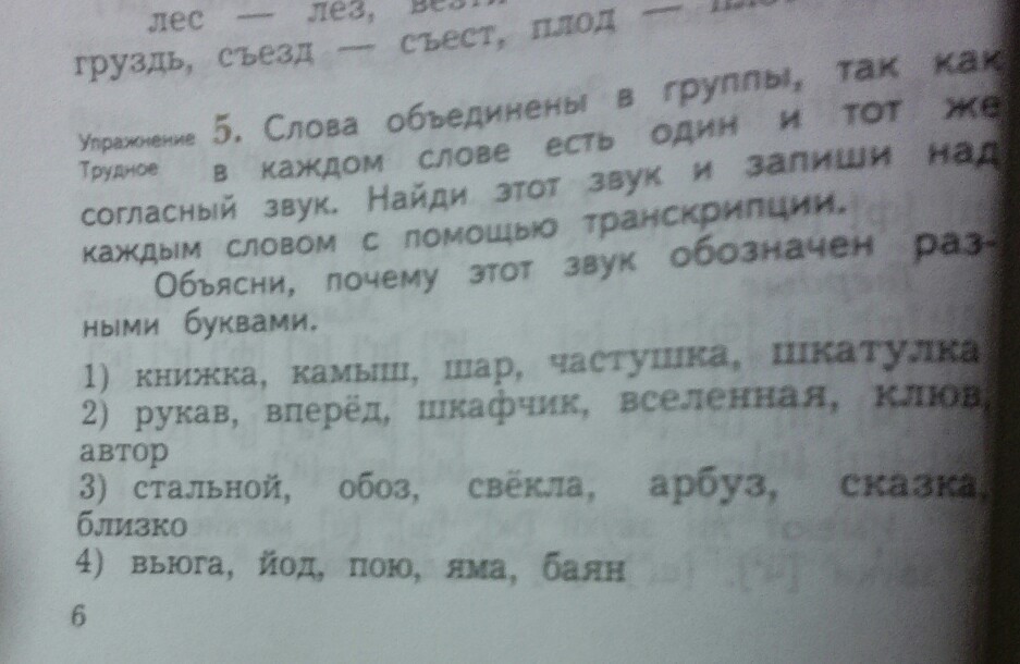 слова объединены в группах, так как в каждом слове есть один и тот же согласные звук.Найди этот звук и запиши над каждым словом с помощью транскрипции.