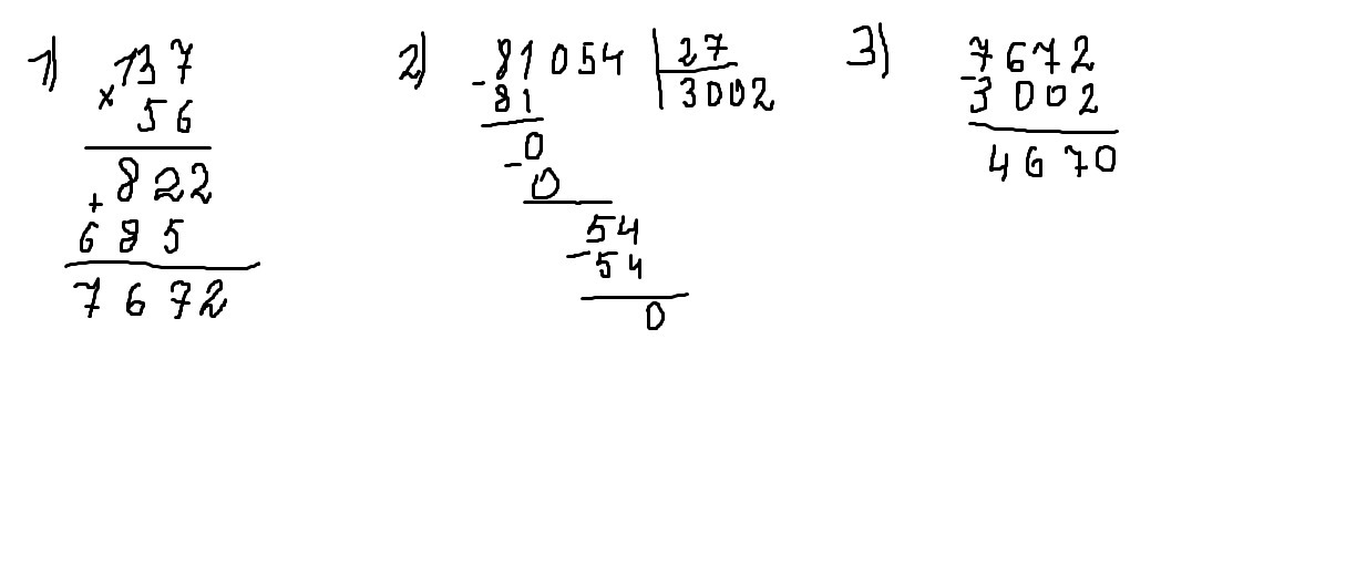 1) 137*56=7672 2) 81054:27=3002 3) 7672-3002=4670