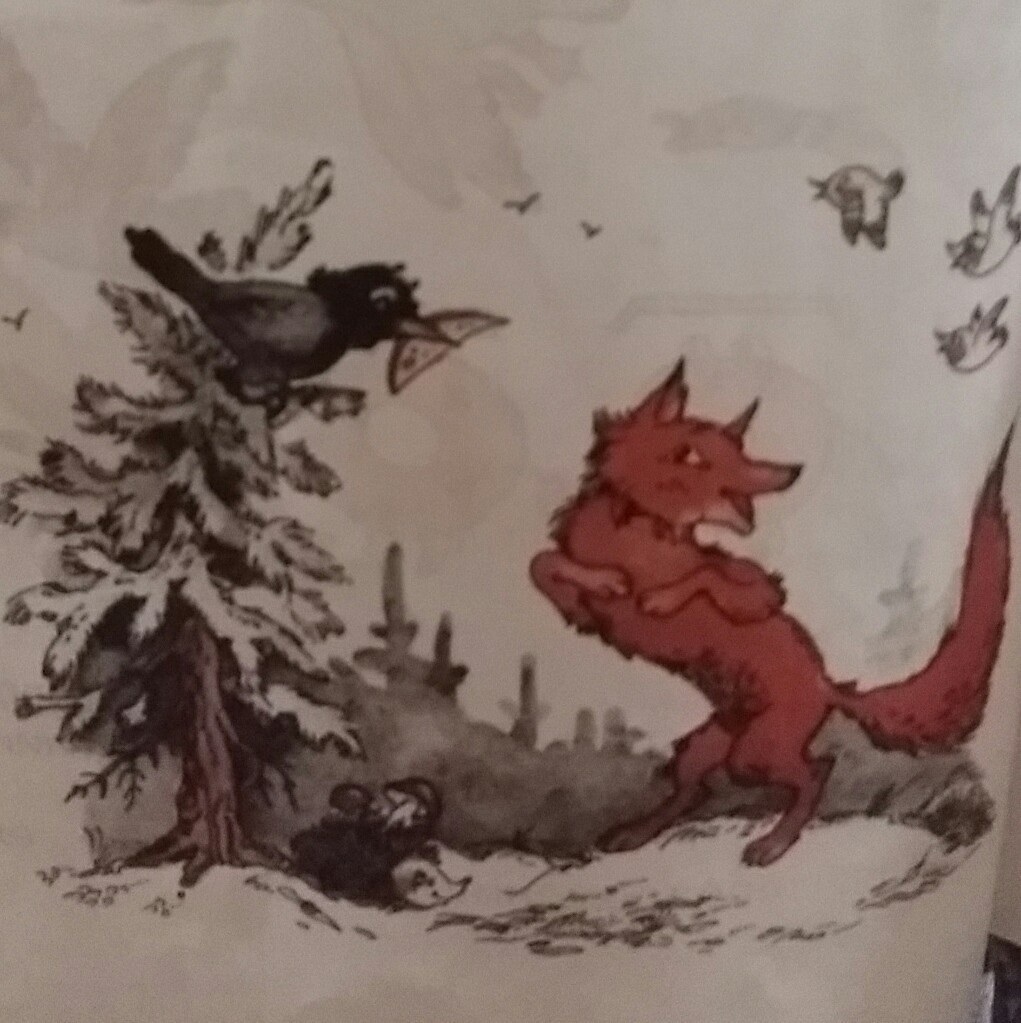 Лисица выпрашивает у вороны сыр ,а ворона не даёт .