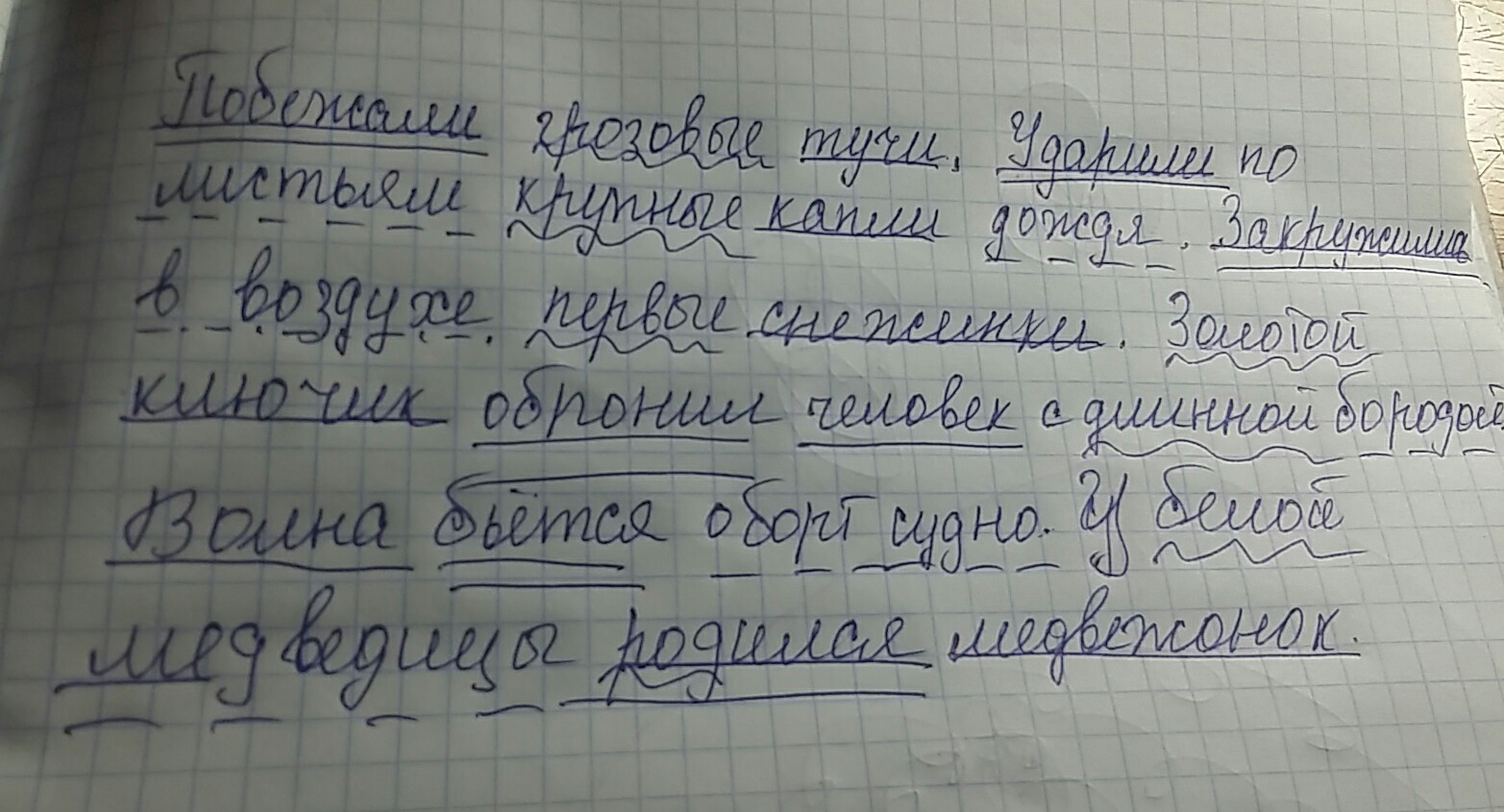 Побежали - гл, сказ. Грозовые - прил, тучи - сущ, подлеж. Ударили - гл, сказ. По - пр. Листьям - сущ. Крупные - прил. Капли - сущ, подлеж. Дождя - сущ. Закружились - гл, сказ. В - пр. Воздухе - сущ. Первые - прил. Снежинки - сущ, подлеж. Золотой - прил. Ключик - сущ. Обронил - гл, сказ. Человек - сущ, подлеж. С - пр. Длинной - прил. Бородой - сущ. Волна - сущ, подлеж. Бьется - гл, сказ. О - пр. Борт - сущ. Судна - сущ. У - пр, белой - прил, медведицы - сущ, родился - гл, сказ, медвежонок - сущ, подлеж.