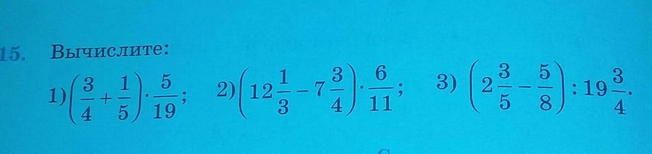 1) (3/4 + 1/5) * 5/19 = ( 15/20 + 4/20) * 5/19 = 9/20 * 5/19 = 45/380