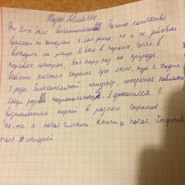 Бұл жаз таңғаларлықтай болды.Жазда көп уақытымды үйде өткіздім бірақ сыртқа шығуды да ұмытпадым. Мен паркте болдым ,сауда орталықтарын араладым,бірнеше рет табиғатта болдым.Әсіресе ЭКСПО жайлы айта кетсем.мен онда 3рет болдым.Тамаша интерьер мен қоса түрлі ұлт өкілдері бар.Және кітап оқыдым сонымен қоса тарихқа қызығып жүрмін