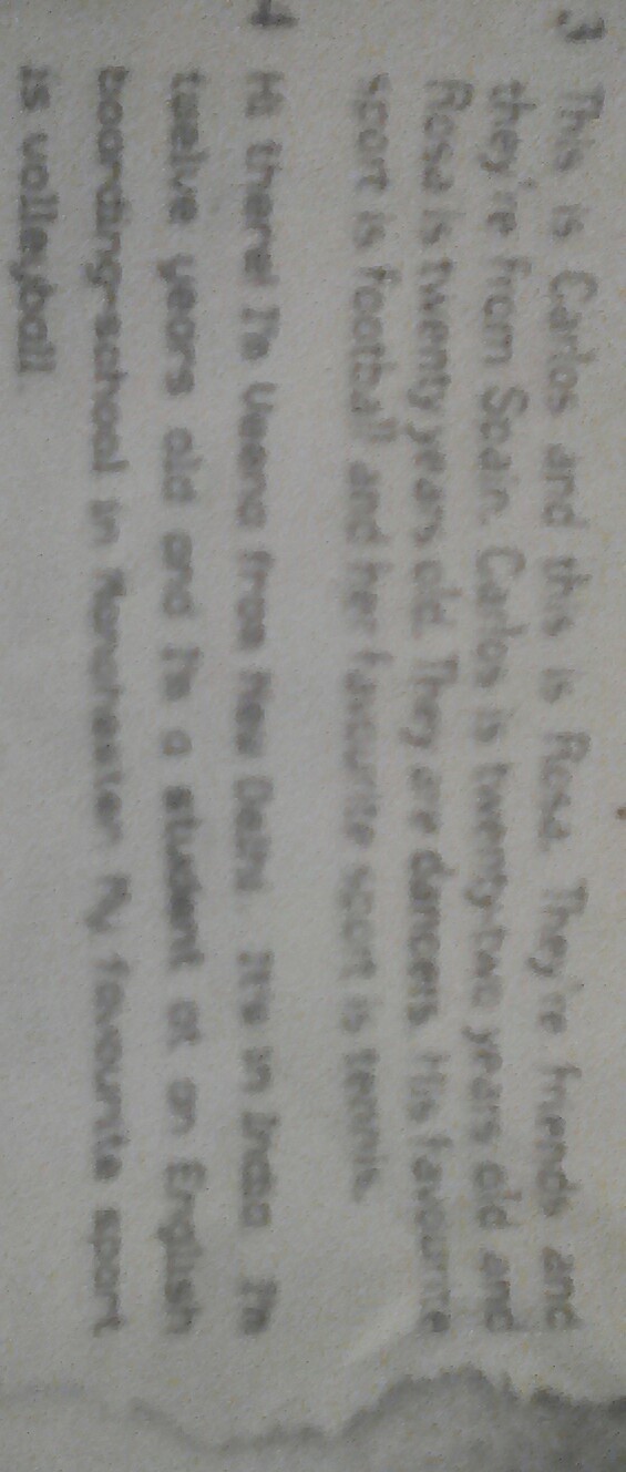 Це є Карлос і це є Роса. Вони є друзі і вони є з Іспанії. Карлосу є двадцять два роки і Росі є двадцять років. Вони є танцюристи. Його улюблений спорт є футбол і її улюблений спорт є теніс ( 3 завдання )