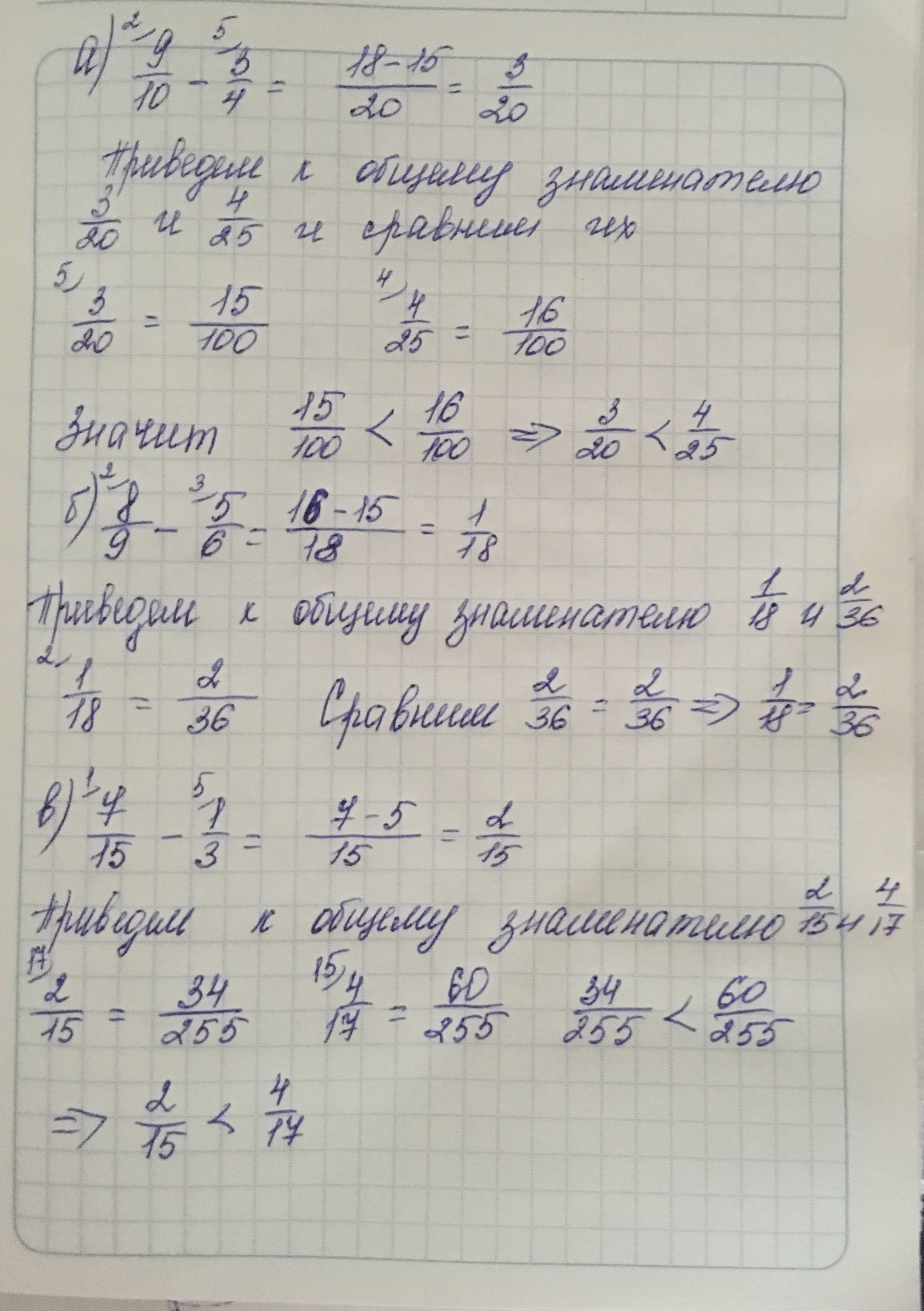 выполните действие и сравните результат с указанным числом а) 9/10-3/4 и 4/25