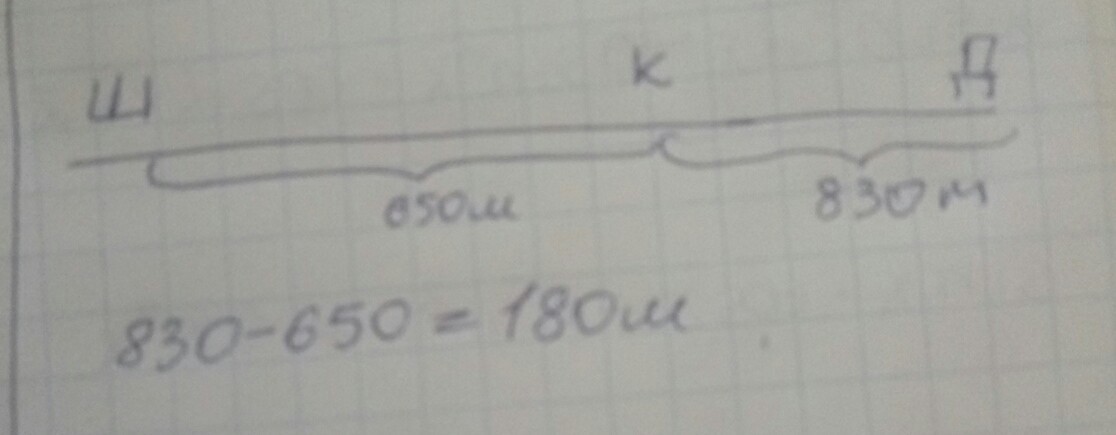 расстояние от школы до кинотеатра 650м, а от кинотеатра до дома 830м.На сколько расстояние от школы до кинотеатра меньше расстояния от кинотеатра до дома?