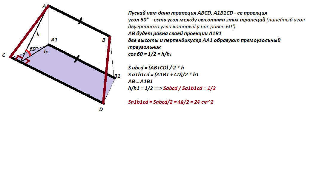 Площадь трапеции равна 48 см2, а угол между плоскостью ее проекции и плоскостью трапеции составляет 60°. Найдите площадь проекции данной трапеции.